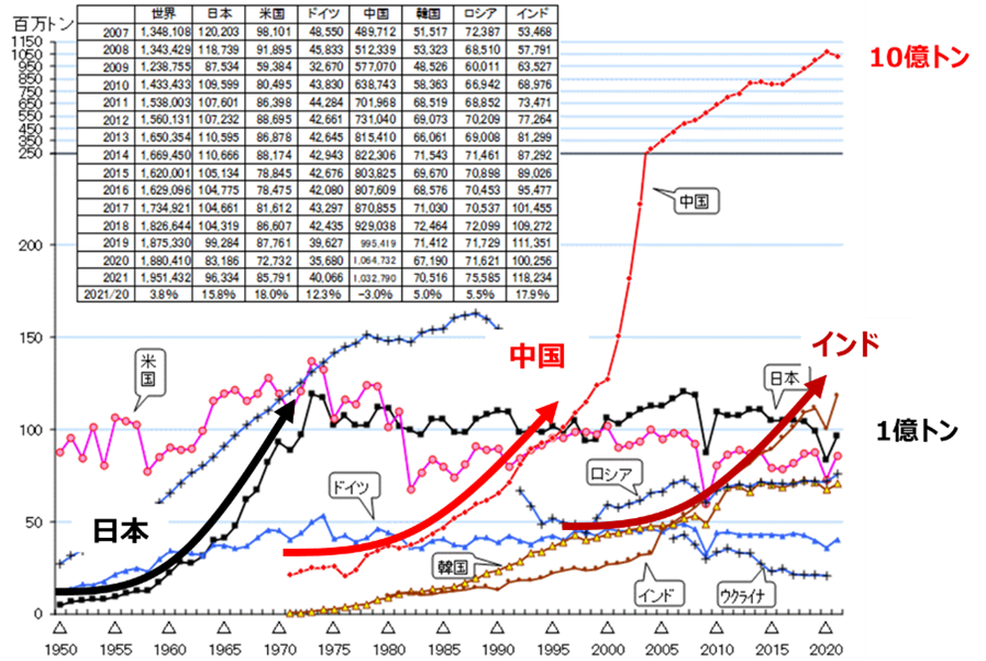 あれよあれよという間に中国はさらに生産量を伸ばし、2020年には10億トンに達しています。なんと日本の10倍!